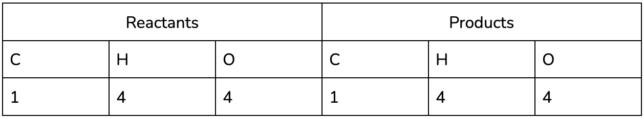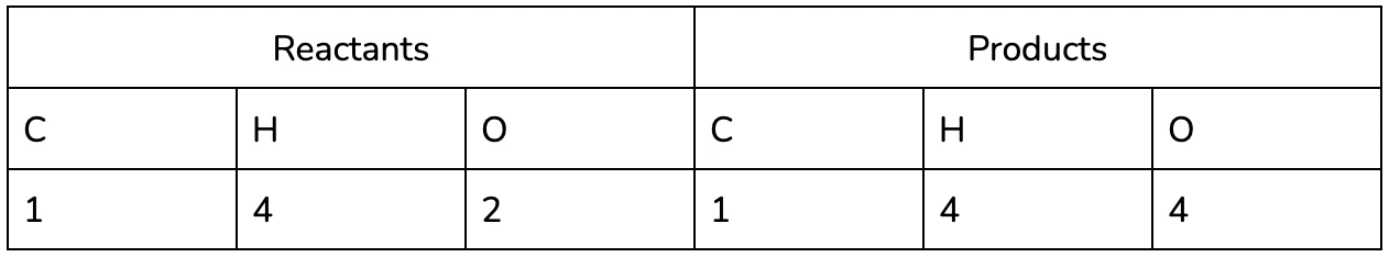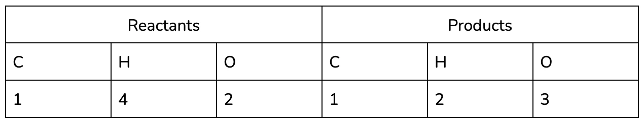 It’s easy to see now that the equation isn’t balanced - we’ve lost two hydrogen and gained an oxygen between the reactants and the products!