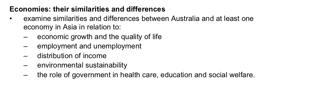 In Year 11 preliminary economics, your syllabus tells you the EXACT ‘subtopics’ you need to base your body paragraph arguments on! In this case, the arguments in your essay would be based on the comparison in relation to: