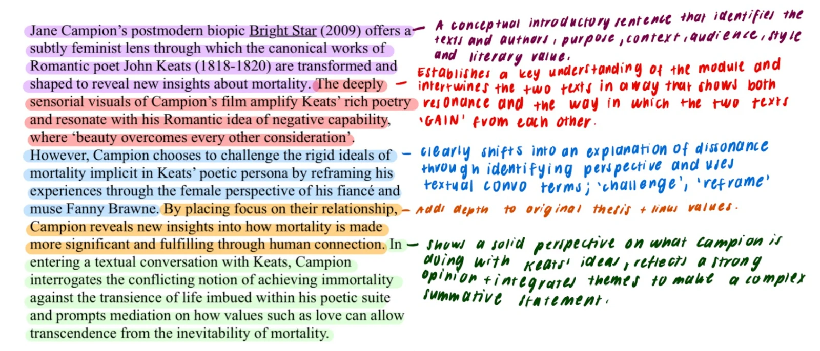I always personally found Campion a little bit harder than writing for Keats, but once you realise that Campion is just working off of Keats ideas, it gets a little bit better. In this essay structure, your Keats paragraphs will never really have any textual conversation bits in it, and these have to shine in your Campion paragraphs. As such, the first sentence must compare and integrate the two authors. You must make links between Keats and Campion in every bit of evidence!! In Mod A rubric terms/words specific to the module are really important. Try to make a bank of these to throw into your writing - e.g in this paragraph: offers reprieve, dissonance, reimagine, pays homage, transformed, reveals a new insight.